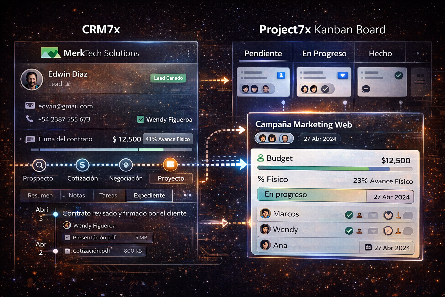 Project7x y CRM7x nacen para unificar en un solo flujo inteligente la preventa, el kanban de ventas y el ciclo de vida del proyecto, eliminando rupturas entre áreas. Desde la oportunidad comercial, cada cotización aprobada se transforma automáticamente en proyecto, conservando trazabilidad, responsables, hitos y compromisos. El kanban deja de ser solo comercial y se conecta con la ejecución real, permitiendo visibilidad del avance, riesgos y entregables. Así, ventas, proyectos y gerencia operan sobre una misma verdad, con datos en tiempo real para decidir, priorizar y asegurar rentabilidad.