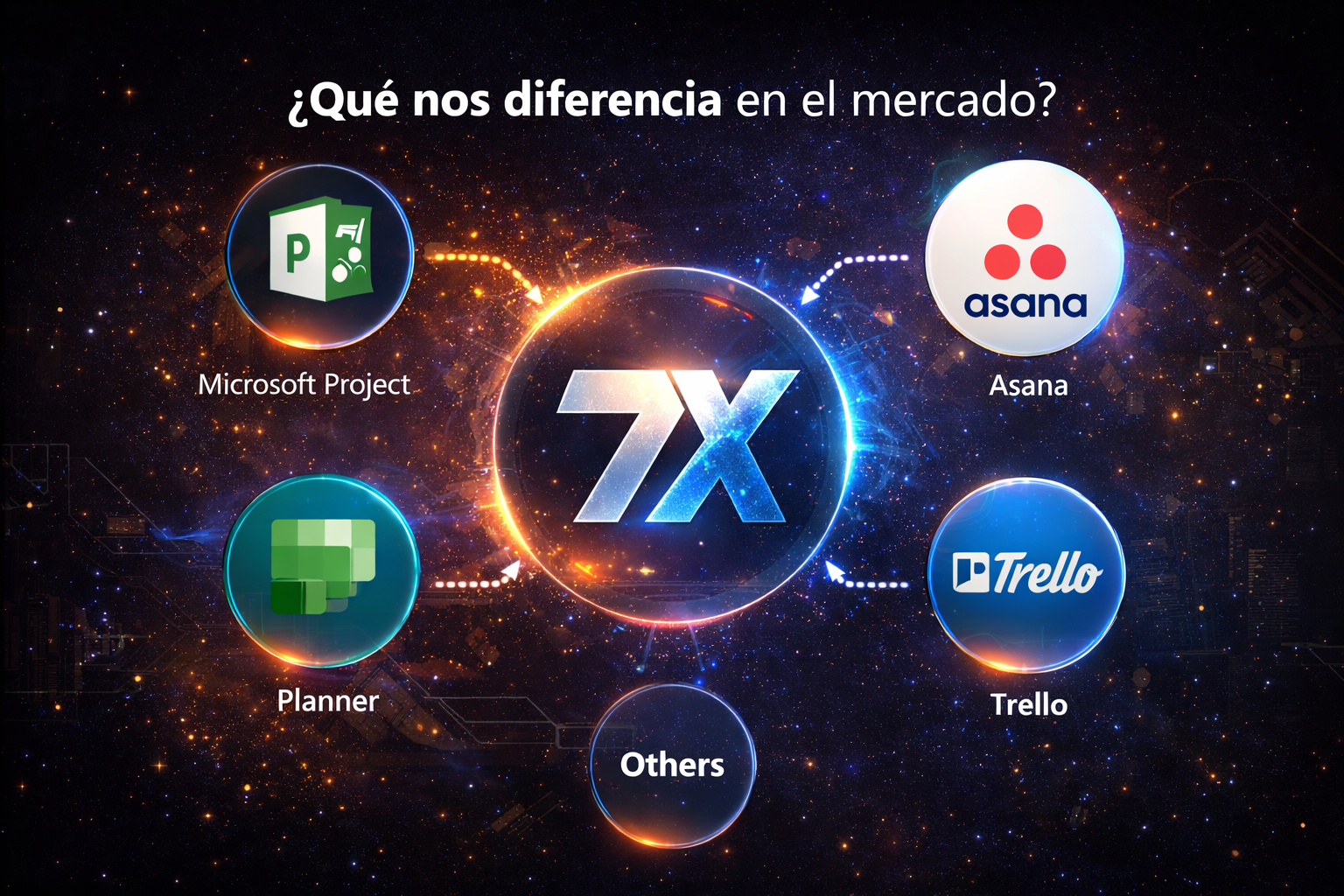 7x representa un enfoque de 7 dimensiones para ejecutar con disciplina: alcance, tiempo, costo, calidad, riesgos, comunicación y aprendizaje.